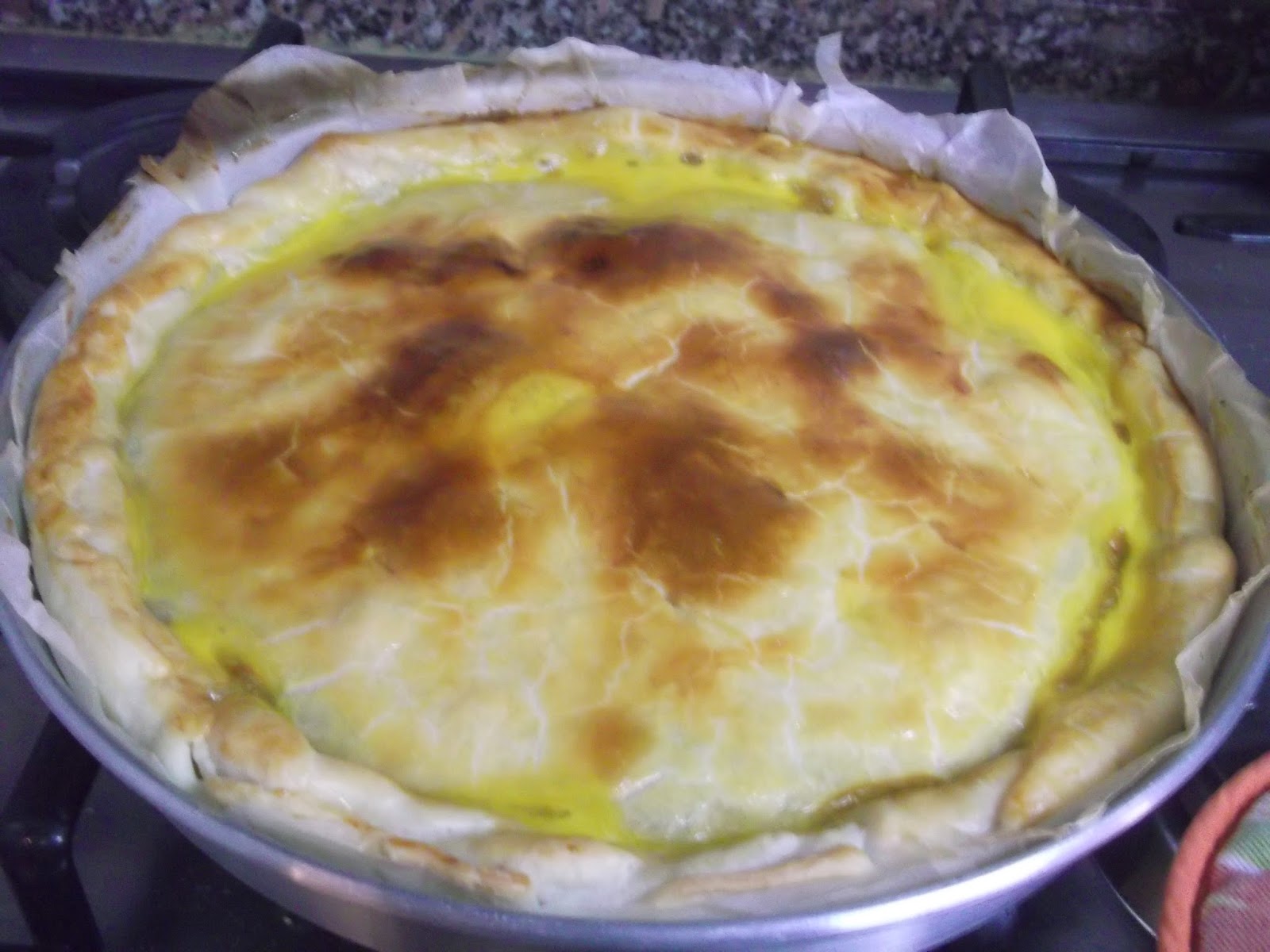 Com a outra base ,coloquei-a por cima ,bati um ovo ,pincelei e levei ao forno.